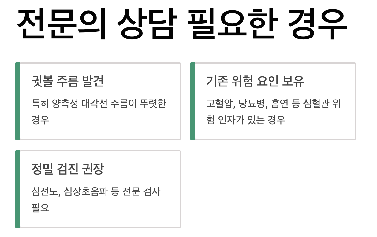 귓볼에 주름이 있다고 해서 무조건 심장 질환이 있다는 의미는 아닙니다. 하지만 고혈압, 당뇨병, 흡연 등 다른 심혈관 위험 요인이 있는 분이 귓볼에 주름까지 발견된다면 반드시 전문의와의 상담과 정밀 검진(심전도, 심장초음파 등)을 고려해야 합니다.