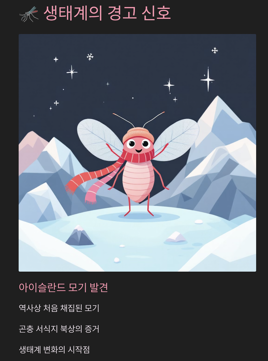 기후변화는 단순히 날씨를 넘어 생태계 전반에 영향을 미치고 있다는 점이 진짜 무서운 것 같아요. 특히 아이슬란드에서 모기가 발견되었다는 소식은 정말 충격적이었어요. 😱 역사상 모기가 채집된 적이 없던 곳인데, 이는 지구 온난화로 곤충의 서식지가 극단적으로 북상하고 있다는 강력한 생물학적 증거랍니다.