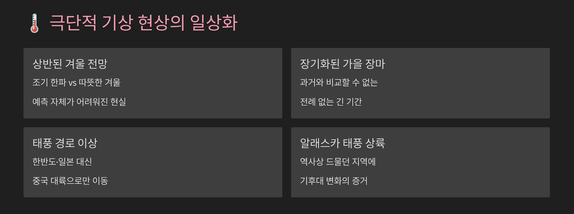 일례로, 이번 겨울 날씨만 해도 조기 겨울 한파와 따뜻한 겨울이라는 상반된 예측이 동시에 나오고 있잖아요? 이 자체가 기상 예측이 그만큼 어려워졌다는 뜻이래요. 핵심은 "이상 기후가 이제 정말 일상이 되어가고 있구나"라는 현실 인식이 필요하다는 점입니다.