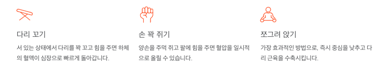전조증상이 올 때 이 동작들을 하면 혈압을 순간적으로 높여 실신을 막거나 지연시킬 수 있습니다.