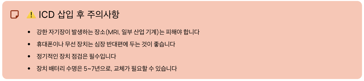ICD를 삽입한 경우, 강한 자기장이 발생하는 장소(MRI, 일부 산업 기계)는 피해야 하며, 휴대폰이나 무선 장치는 심장 반대편에 두는 것이 좋습니다. 정기적인 장치 점검은 필수입니다!