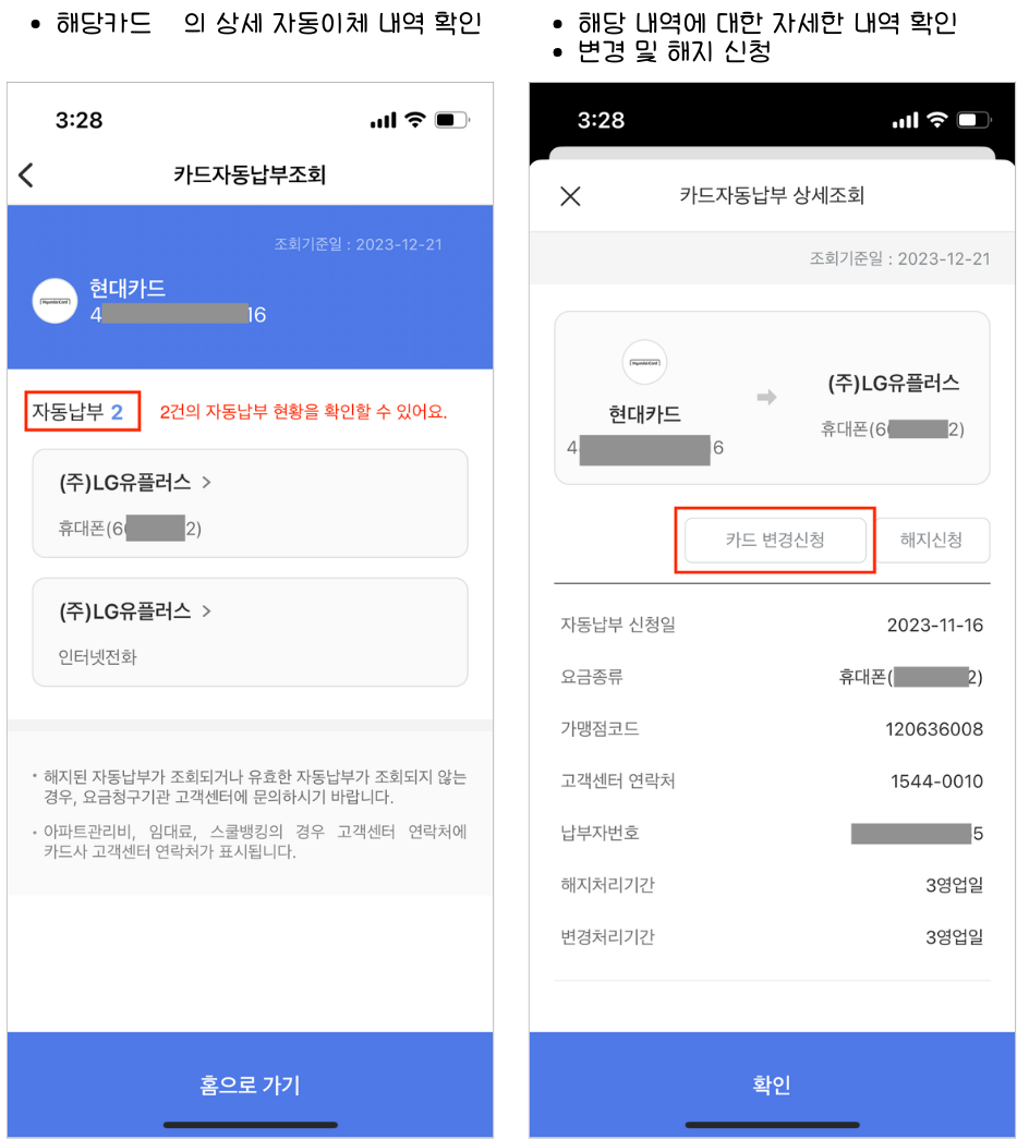 변경 전 카드사에서 카드 자동납부 혜택 등을 받고 있다면 타카드로 자동납부 변경 시 할인적용이 되지 않을 수 있으니 반드시 혜택 조건을 확인한 후 변경 신청하셔야 합니다.