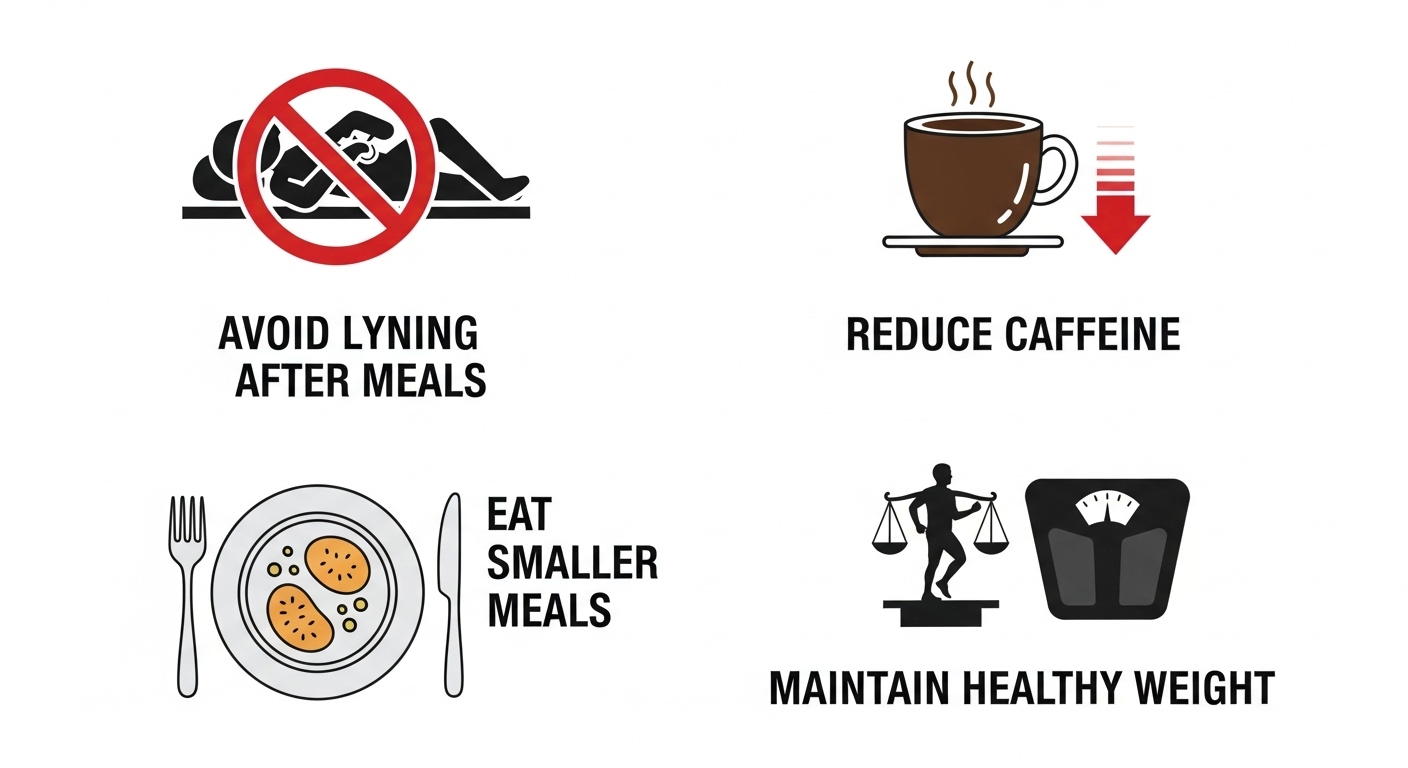 - 과식 피하기: 배가 너무 부르면 위 내부 압력이 높아져 위산이 역류하기 쉬워요. 조금씩 자주 드시는 것이 좋습니다.
