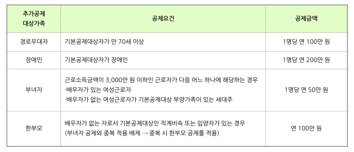 추가공제는 기본공제 대상자가 경로우대자, 장애인, 부녀자, 한부모에 해당하는 경우 추가로 공제할 수 있습니다.