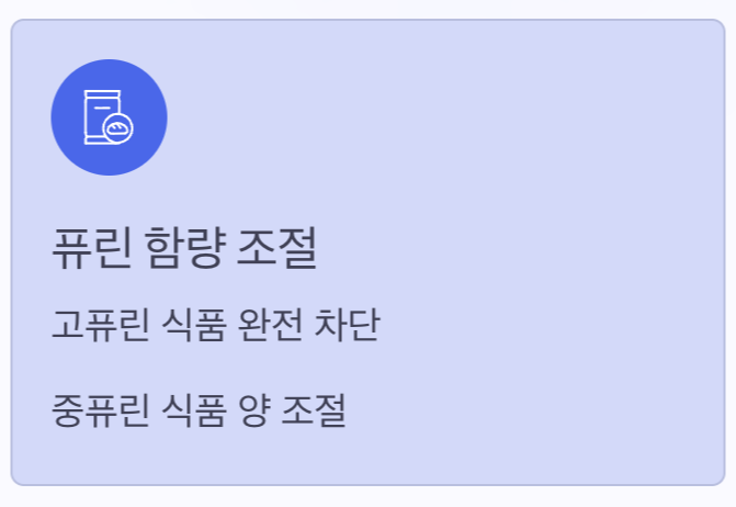 - 퓨린 함량 조절: 고퓨린 식품은 확실히 피하고, 중퓨린 식품은 양을 조절해서 섭취해야 합니다.