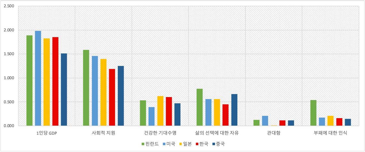 궁금함을 참지 못하고 각 항목별 점수를 자세히 살펴봤다. 1위 핀란드 뿐 아니라 우리나라와 밀접한 관계가 있는 나라들도 포함시켜서 한 눈에 볼 수 있도록 그래프를 그렸다. 사회적 지원 부문에서 중국보다 낮다는 점은 충격적이다. 물론, 이 조사의 경우 응답자가 주관적인 기준으로 답변을 했기 때문에 팩트체크로 논쟁하기 어려운 부분이 있다. 그럼에도, 해당 국가의 국민들이 느끼는 것들을 답변했다는 것을 감안하면 한국인이 느끼고 있는 불안함의 크기가 실감된다. "곤경에 처했을 때 아무도 나를 도와줄 사람이 없다."