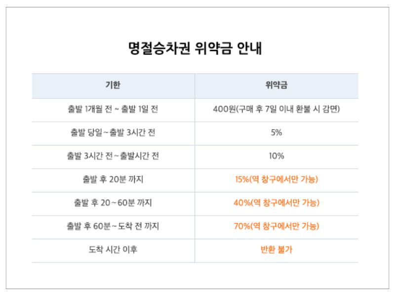 승차권을 반환할 경우 시간별로 상이한 위약금이 부과됩니다.