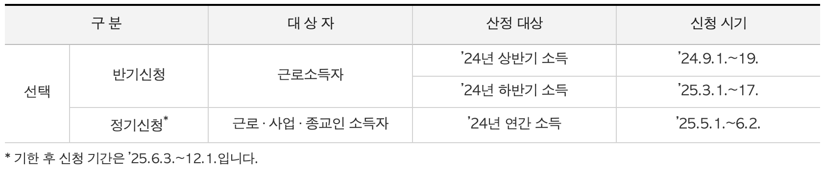 근로소득만 있는 경우 반기신청 또는 정기신청을 선택하여 신청할 수 있고, 사업 또는 종교인 소득이 있는 경우는 정기신청을 해야 합니다.